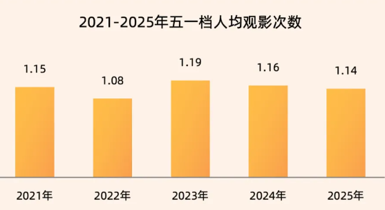 2025年“五一”档,女性购票占比稍有回落,性别分布更为均衡,30岁以上成熟用户占比进一步提升。一线城市票房占比提升,三四线城市票房贡献较往年持平。档期内人均观影1.14次,观影活跃度同比去年降低,92%的观众在档期内只看一部影片。档期内单均购票张数1.82张,结伴观影属性降低。