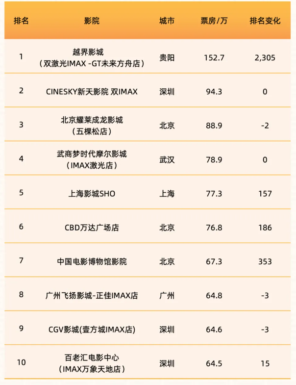 贵阳越界影城(双激光IMAX-GT未来方舟店)以152.7万元票房占据影城榜榜首,其影城档期票房的89%由《哪吒2》产出。早在春节档期间,该影城就凭借超大的IMAX屏幕和4K激光放映系统等技术成为“网红影城”。该影城异地购票占比超55%,带动观众流入。记者盘点发现,不少在贵阳旅游的游客选择打卡该影城。受该影城带动,贵州连续五日成为《哪吒2》的单日票房冠军省份。