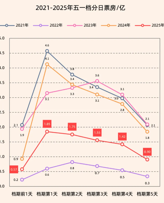 灯塔研究院5月6日发布的“五一”档电影市场洞察报告显示,2025年“五一”档以7.47亿元票房收官。“五一”期间,日均票房1.5亿元,较去年同期下降51.1%。档期首日票房1.85亿元,最后一日票房不足1亿元,其间单日票房均低于2021年、2023年、2024年。