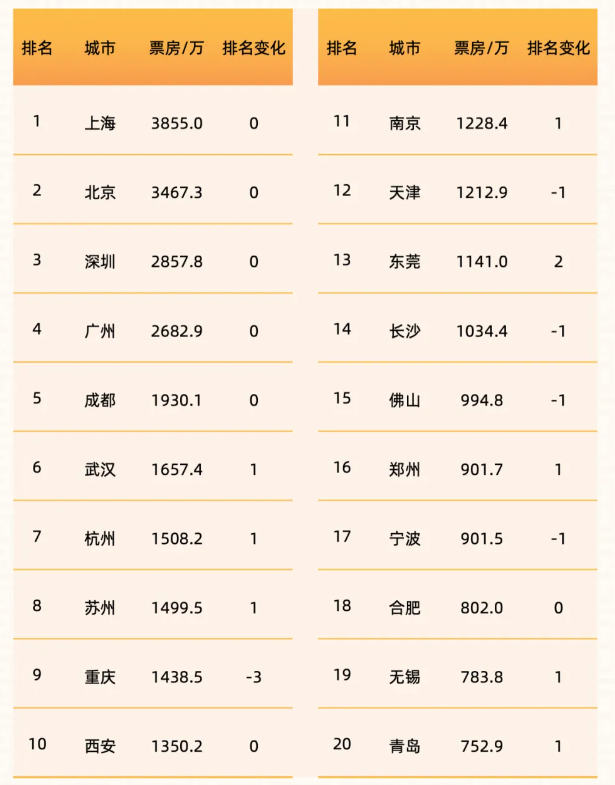2025年“五一”档,上海以3855万元票房占据城市票房榜榜首,北京和深圳分列二三名。前十城市中,武汉、杭州、苏州排名提升,重庆下滑3个位次。